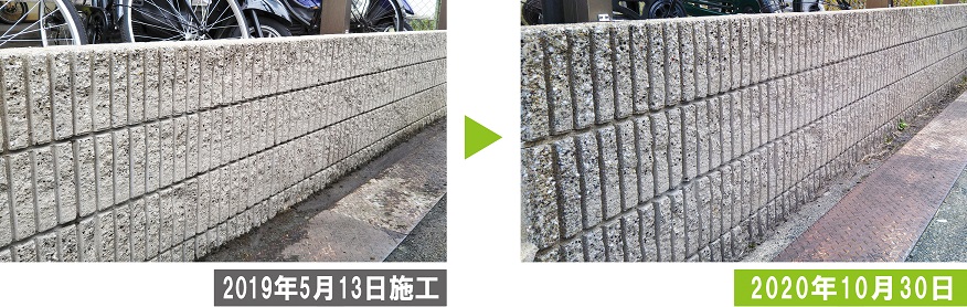 2019年5月に施工したアパート駐車場のリブブロック、2020年10月現在の写真です。2019年5月に排気ガスによる油汚れとカビ汚れのリブブロックをG-Ecoシリーズ環境対応型洗浄剤カビ・ヤニ、G-Ecoシリーズ環境対応型洗浄剤油・マルチで汚れを除去後、コーティングしました。